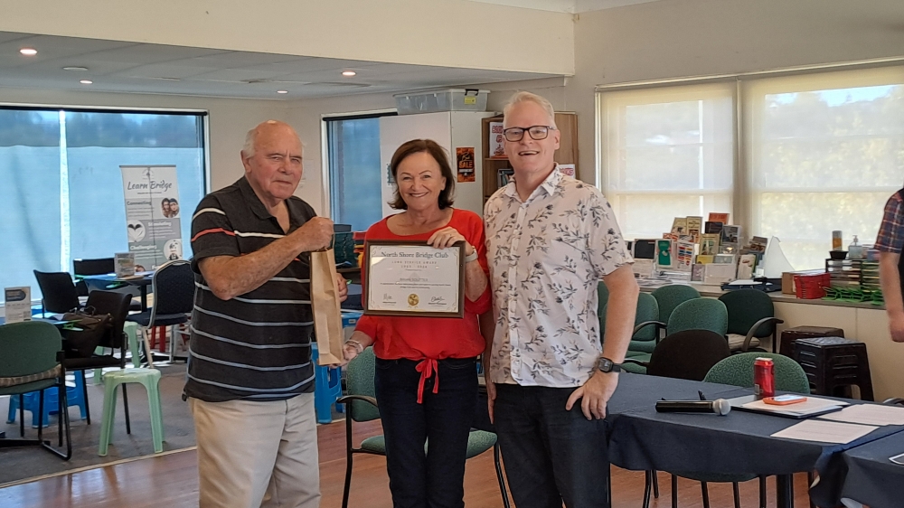 Towards the end of the meeting, Sharon and Gary made a presentation to Brian Soutter. After just shy of 23 years of dedicated service, Brian will be stepping down from his role as a Bridge Director at North Shore Bridge Club.